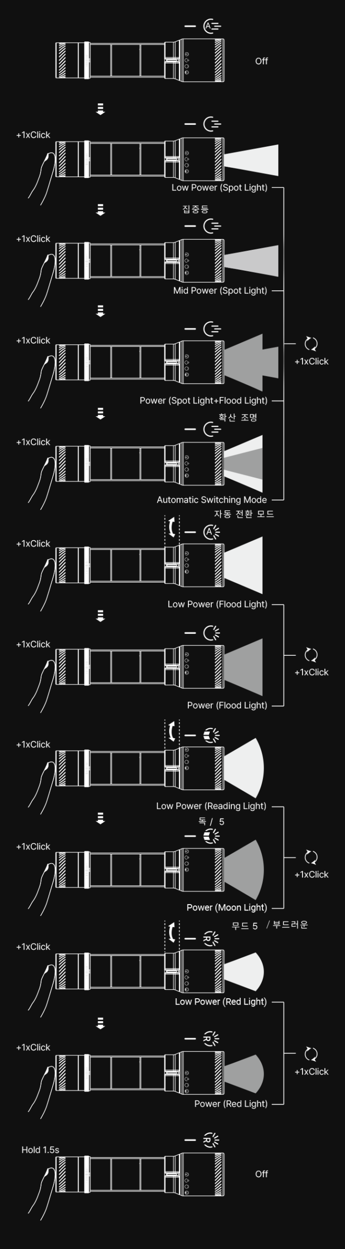 이렇게 하면 원거리 조명, 투광등, 적색 라이트, 독서등 중 어떤 모드든 최적의 조명으로 바로 시작할 수 있습니다